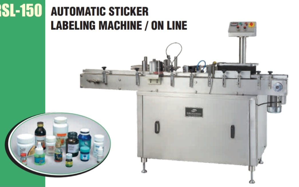 RSL-150 AUTOMATIC STICKER LABELING MACHINE / ON LINE - RADHE PHARMA MACHINERY APPLICATION To apply sticker labels on round shape of container. TECHNICAL SPECIFICATION Speed - Up to 150 labels per minute (Depending on product size and label size) Power - 0.5 H.P. Dimension - 1835 mm (L) x 870 mm (W) x 1450 mm (H) Container Size - O/ 22 mm to O/ 100 mm diameter Label Size - Length : 30mm to 180mm Width : 16mm to 90mm UNIQUE FEATURES - No label data input require for any label size. - No change parts required. - Virtually maintenance free machine. - Fully stainless steel covering. - A.C. Drive for speed control. - In built digital counter. OPTIONAL - Batch coding machine. - Turn table (Un scrambler)